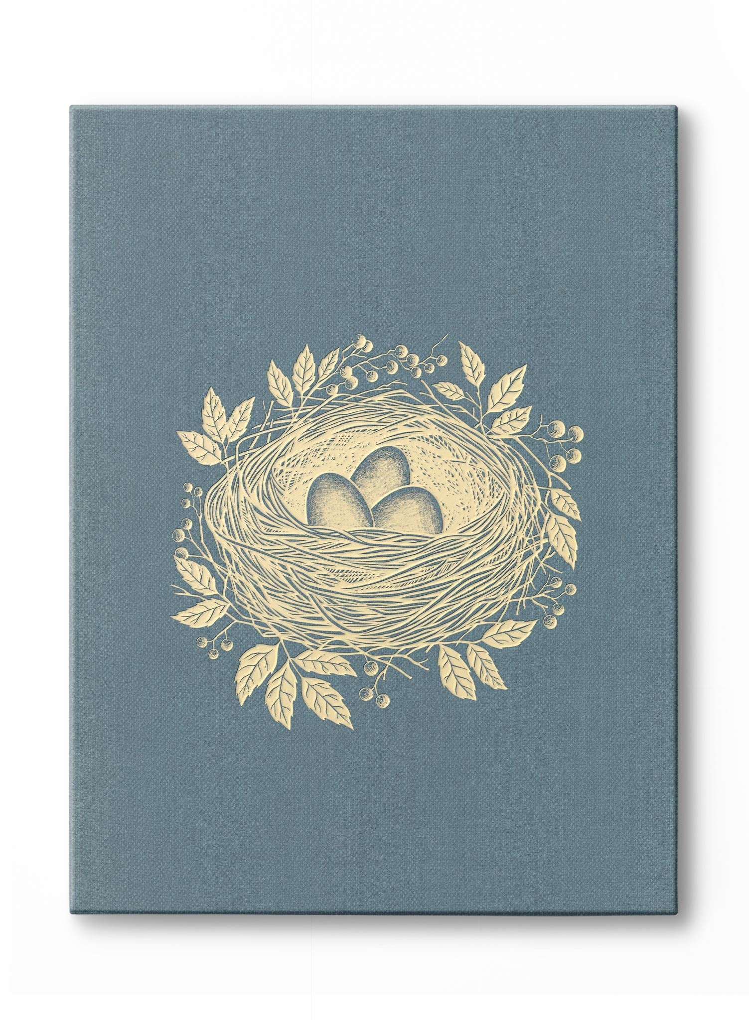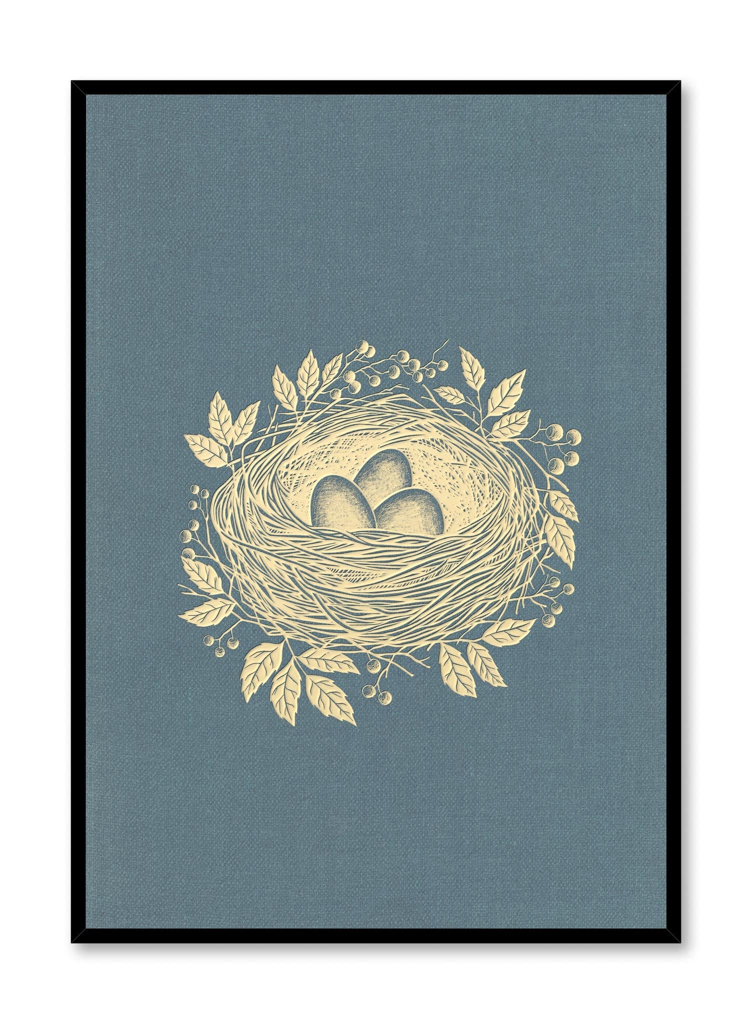 This enchanting art print captures a bird’s nest nestled within a delicate array of leaves and berries, all illustrated in warm golden tones. Set against a muted teal background, the intricate linework and earthy palette give the piece an elegant yet rustic charm. The central focus on the nest evokes themes of home and comfort.